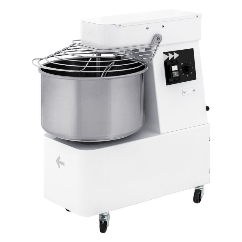 This Spiral Mixer with Removable Bowl is made of high-quality stainless steel with a white enamel coating finish. The bowl, lid, and spiral whisk are made of 18/10 stainless steel.