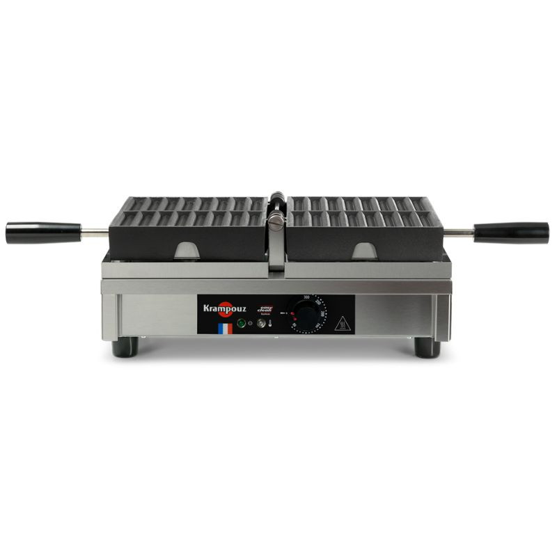 This Professional Double Waffle Maker allows you to make 4 Brussels waffles at a time. Made of stainless steel, this appliance is sturdy and very reliable. With a temperature range between 50 and 300 °C, you can perfectly manage the cooking of your waffles. The cooking plates of this waffle maker are fixed and made of enameled cast iron. Furthermore, the two cooking units are adjustable separately, so you will need two separate plugs for the appliance to work.